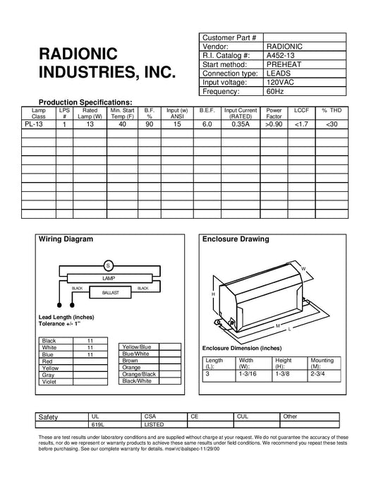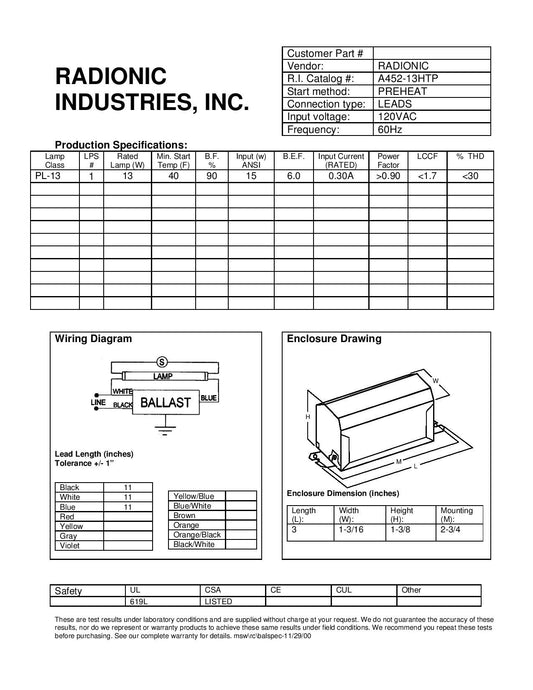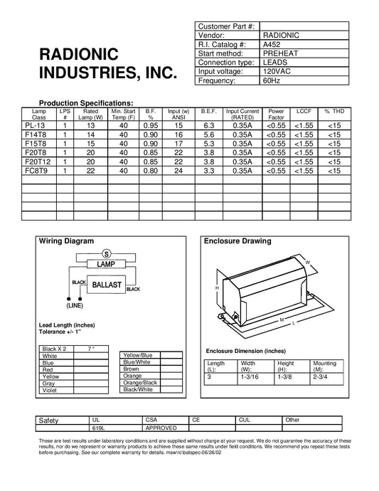 A452 120v for (1) PL-13, F14T8, F15T8, F20T8, F20T12 or FC8T9 lamp