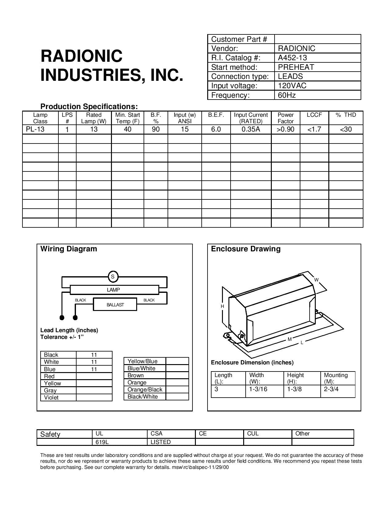 Radionic Industries Preheat Magnetic Fluorescent Ballast 120VAC, 60Hz for (1) PL-13 Fluorescent Lamp
