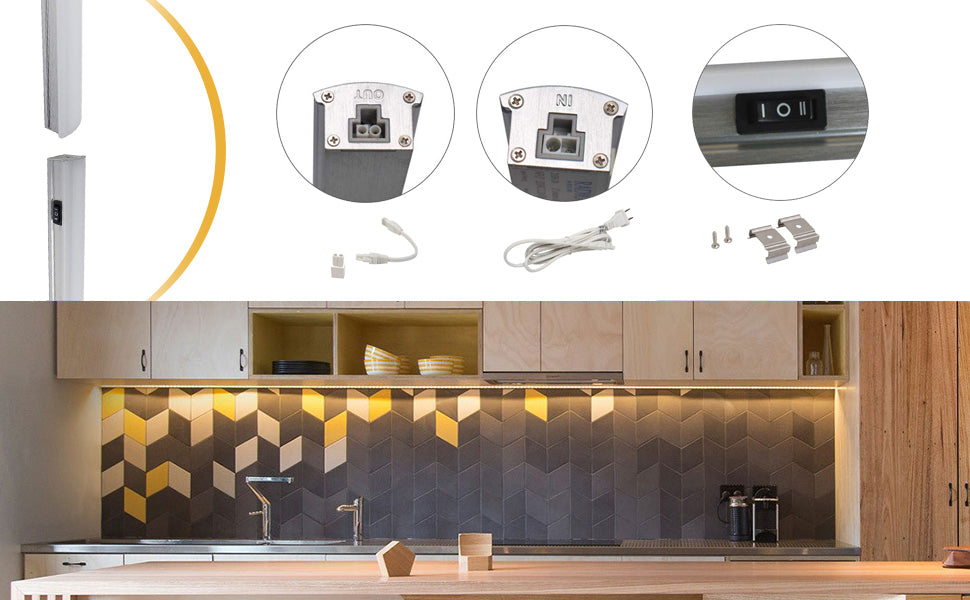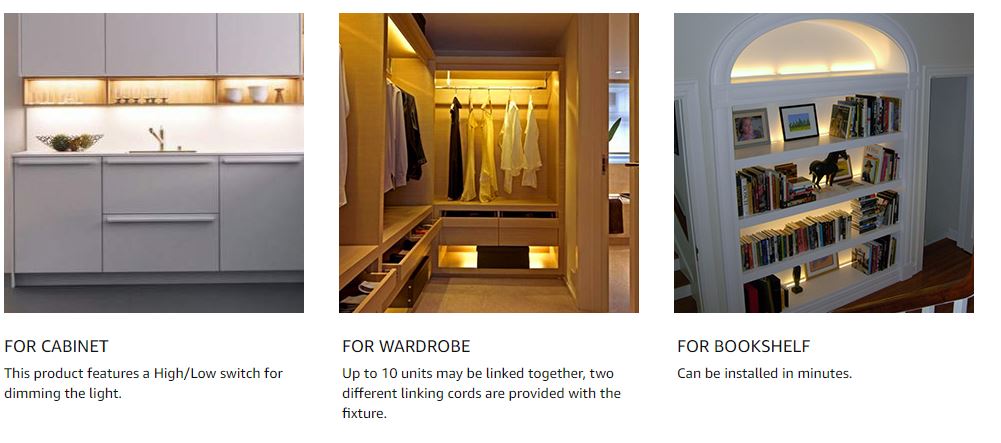 This Radionic Hi Tech Inc. 19″ LED lighting fixture with Hi / Low Switch with Cool White LEDs is perfect for under cabinet or task light applications. This fixture emits 663 lumens of light. This fixture offers huge energy saving; it uses 50% less energy compared to a typical F13T5 fluorescent under cabinet fixture. This fixture is Lighting Facts independently tested and certified. The fixtures sleek design is less than 1 inch in height. The fixtures are linkable with connecting cable included or they can be linked end-to-end with additional fixtures to have longer continuous light. The lighting fixture has an internal power supply, just plug it in and turn it on.